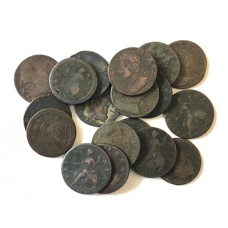 A COLLECTION OF HALFPENNIES 17th AND 18th CENTURIES. Halfpennies, William and Mary, George II and others. 18 coins.