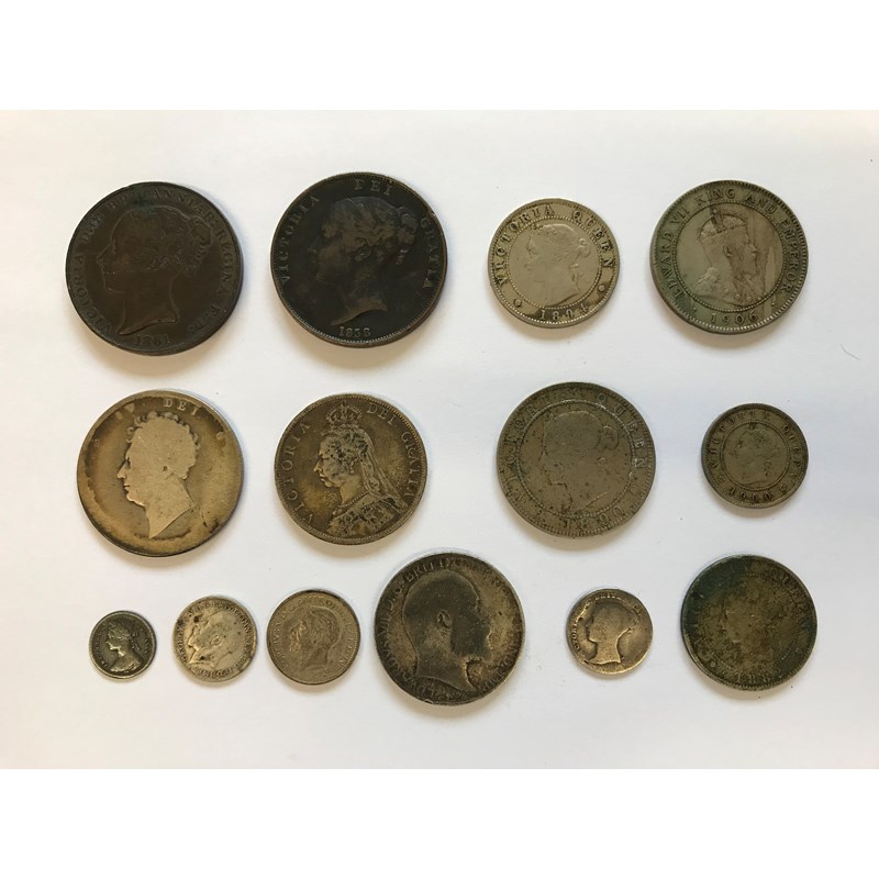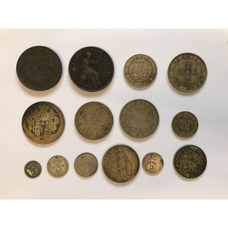 A SMALL COLLECTION OF PRE-DECIMAL AND JAMAICAN COINS. A smalll collection of coins including an 1845 Fourpence, 1858 Penny, 1890 Florin, 1907(?) Florin, Jamaican 1890 and 1906 Penny and others. 14 coins.