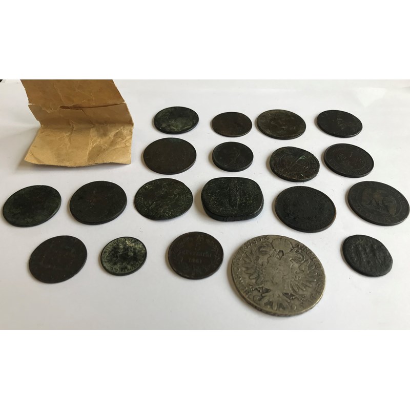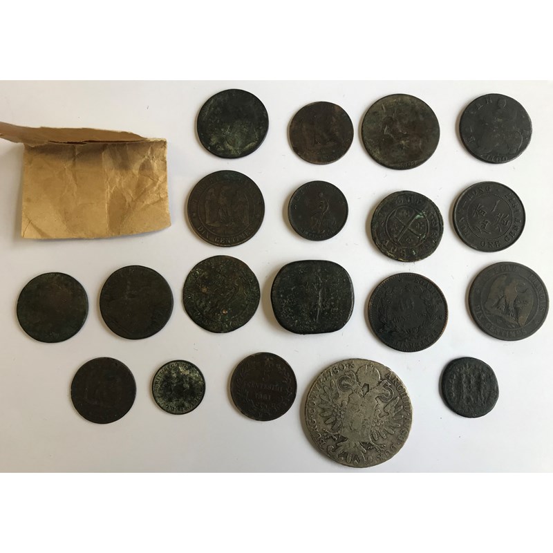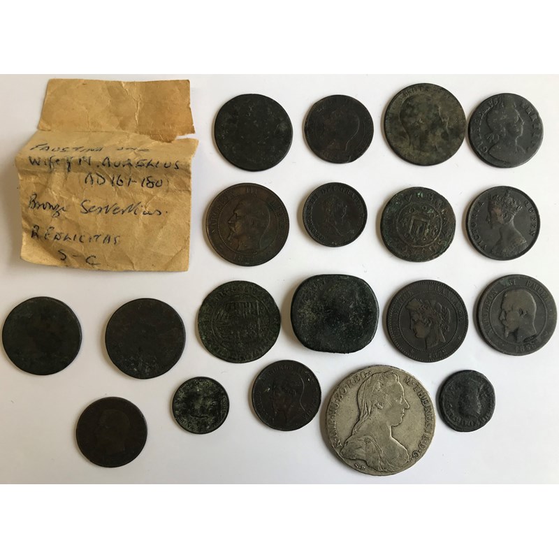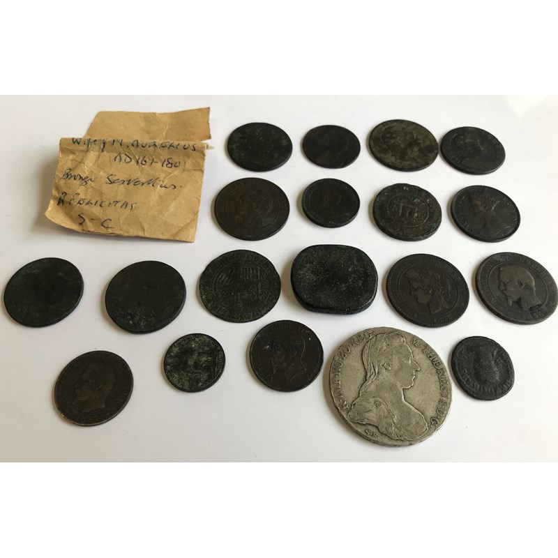 A small group of coins to include a George III Farthing dated 1799, a Marie Therese Thaler, two Roman coins and others. 19 coins.