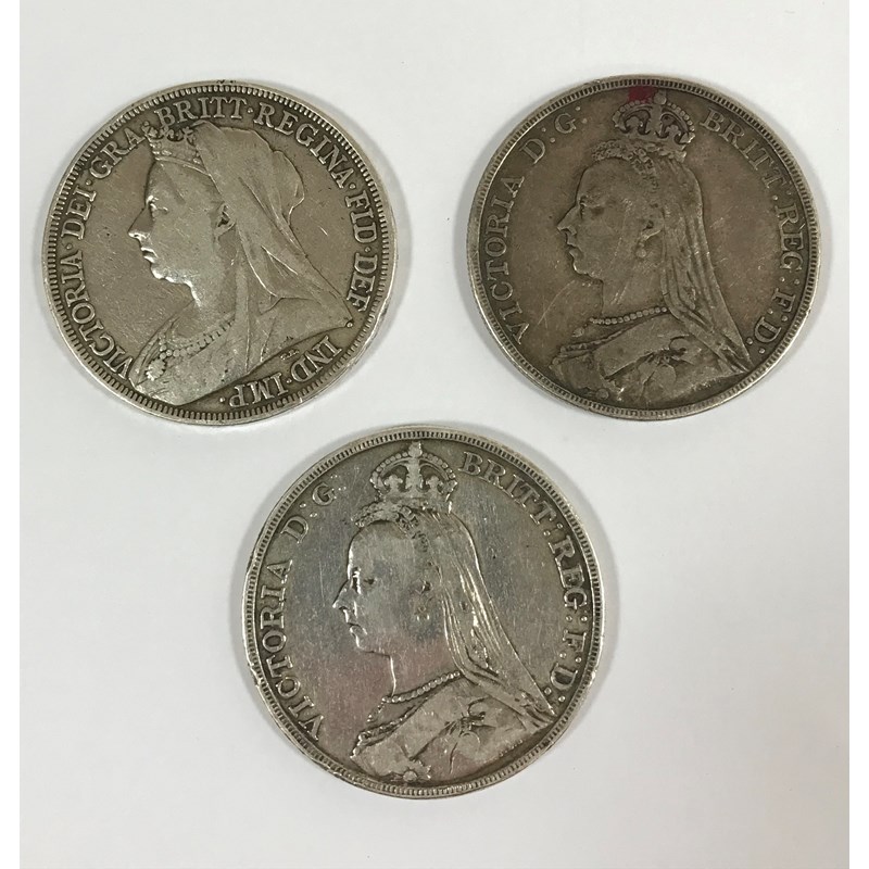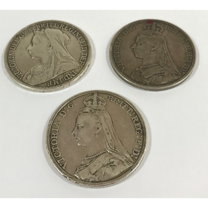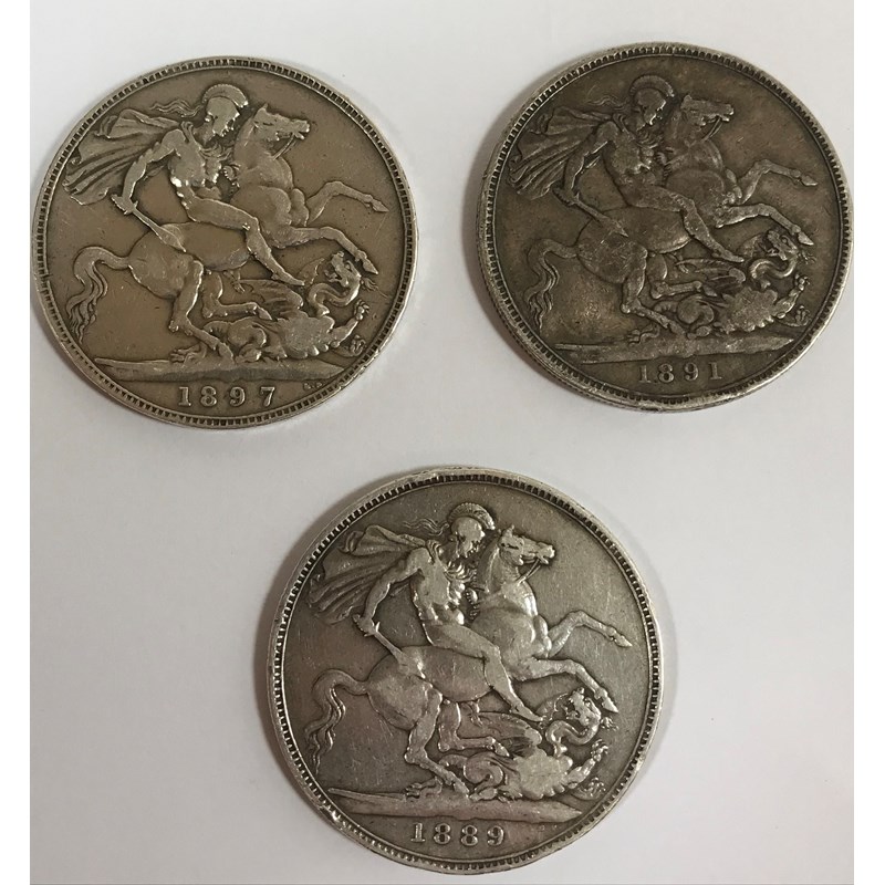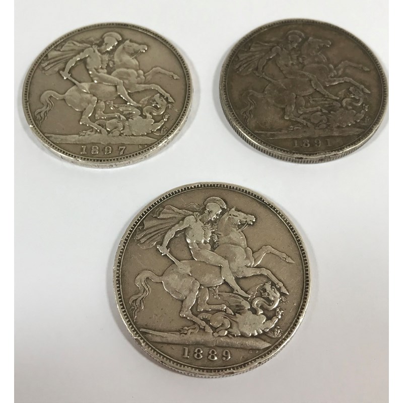 THREE VICTORIAN CROWNS. Queen Victoria, Crowns: 1889, 1891, 1897 rim LXI. 3 coins.