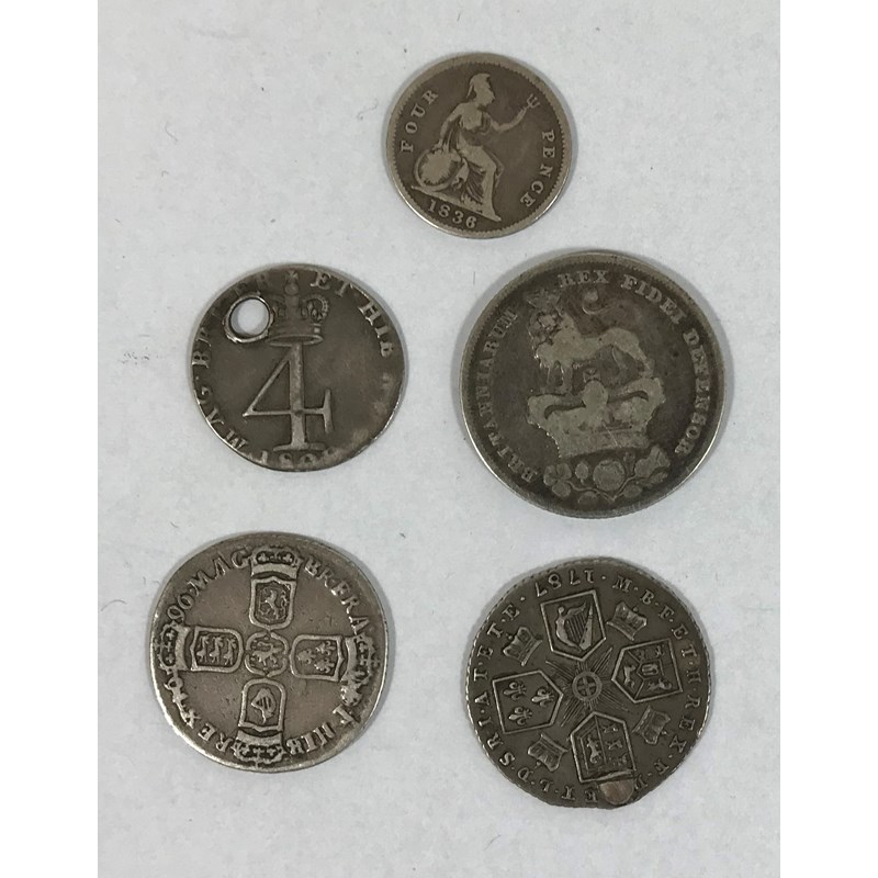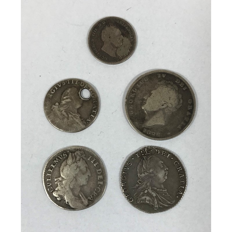 A William III Sixpence dated 1696, A George III Sixpence dated 1787 previously mounted for suspension, a George III Fourpence, 1800 (?) pierced, a William IV Fourpence dated 1836, A George IV Shilling dated 1826. 5 coins.