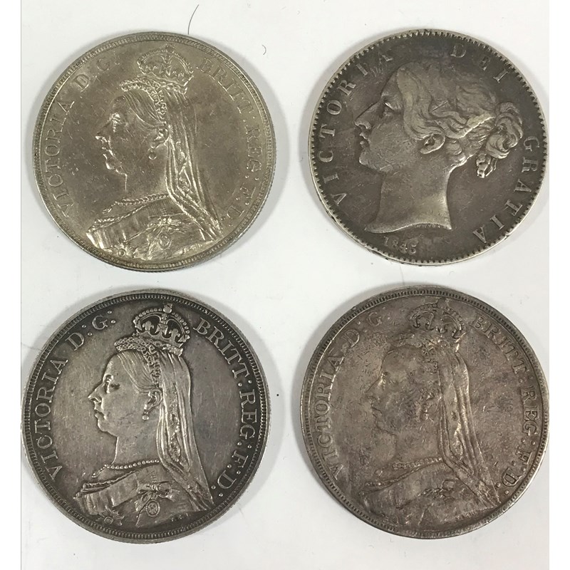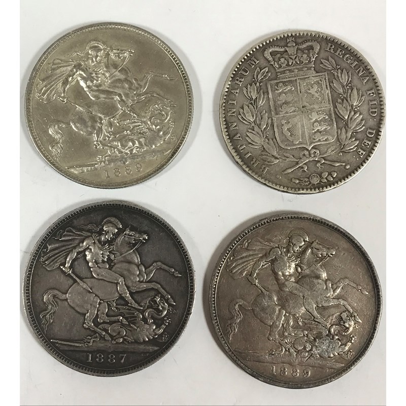 FOUR VICTORIAN CROWNS. Victorian Crowns: 1845, 1887, and 1889 (2). 4 coins.