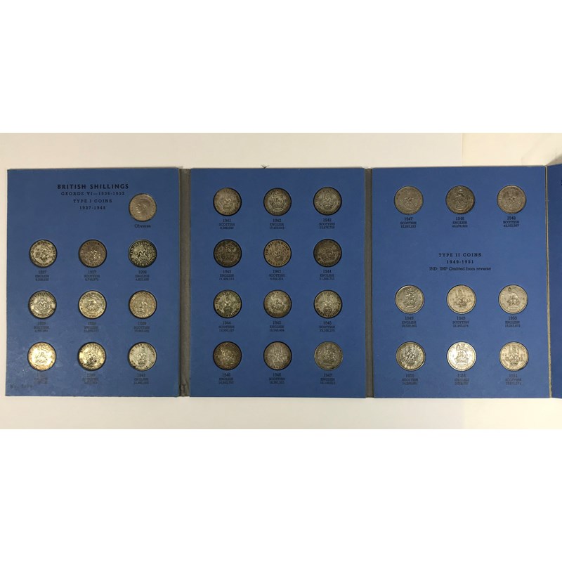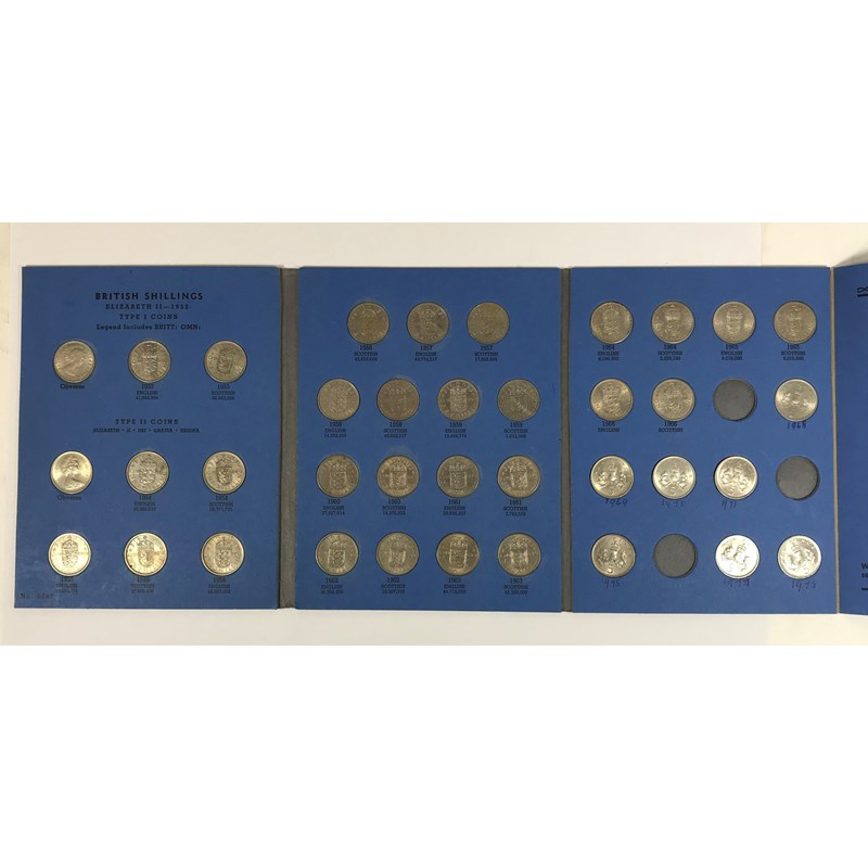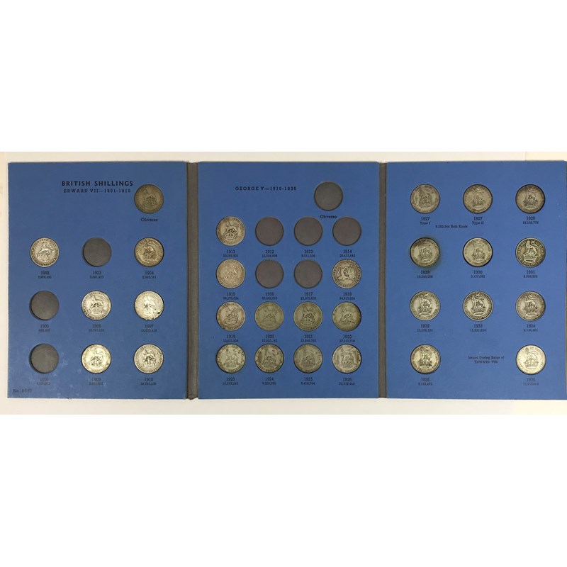 Shillings for 1826 (pierced), 1920, 26 (2), 28 (3), 29, 32, 33 (5), 35 (3), 36, and three Whitman folders of shillings 1902 - 1936 (lacking 8 years) 1937 - 1951 (lacking English 1941 otherwise complete), 1953 - 66 complete with 7 additional 5p pieces. 116 coins.