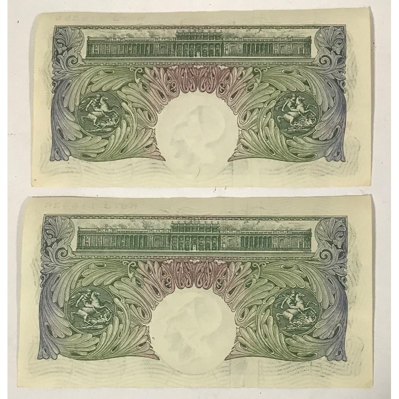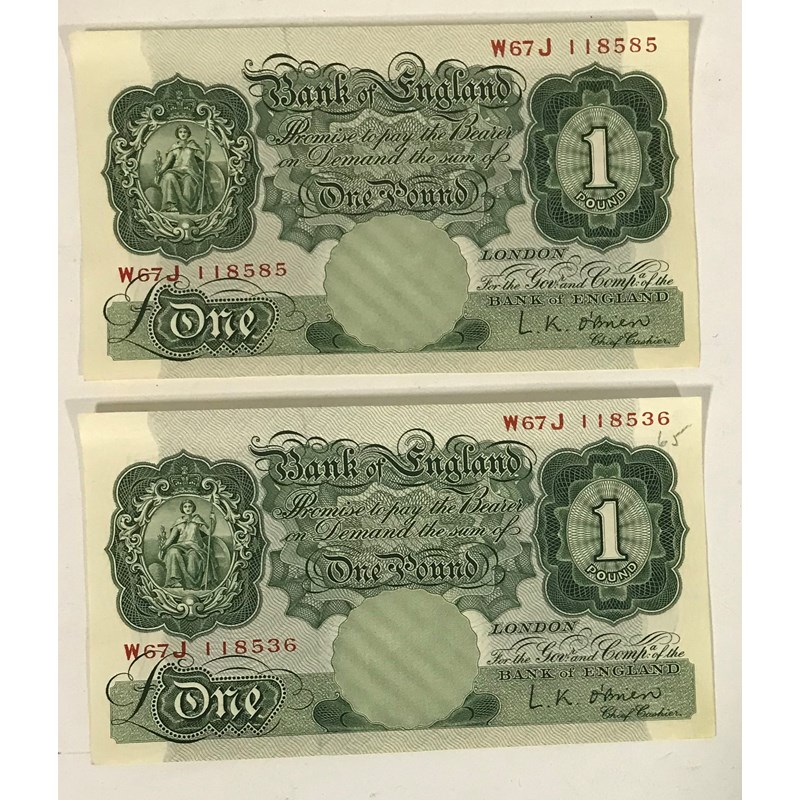 Two green Series A one pound notes with similar numbers W67J 118536 ans W67 118585, signed by L.K.O'Brien. (2 notes)