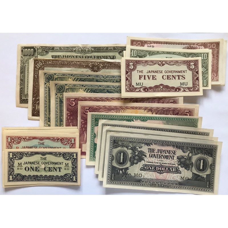 Japanese Government banknotes issued by the British: one cent, five cents, ten cents, fifty cents, half rupee, one dollar, one rupee, five dollars, ten dollars, 100 dollars and one thousand dollars. 31 notes.