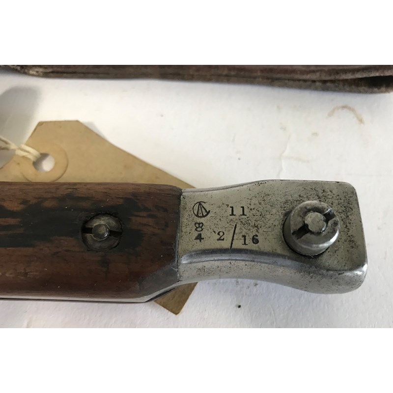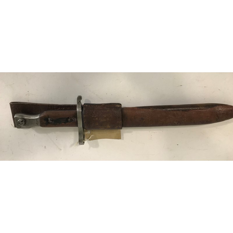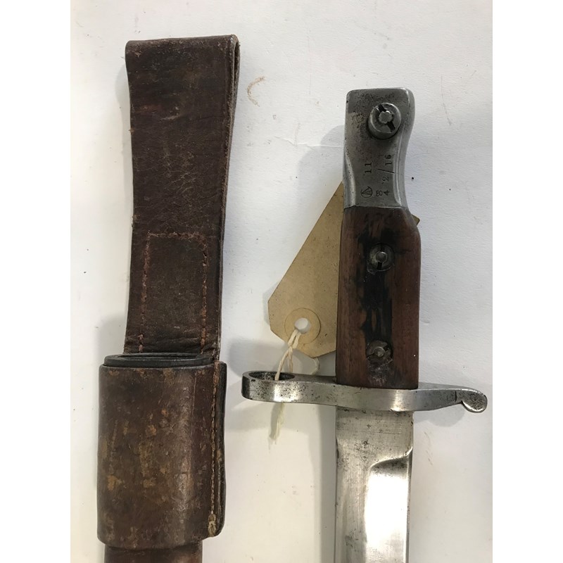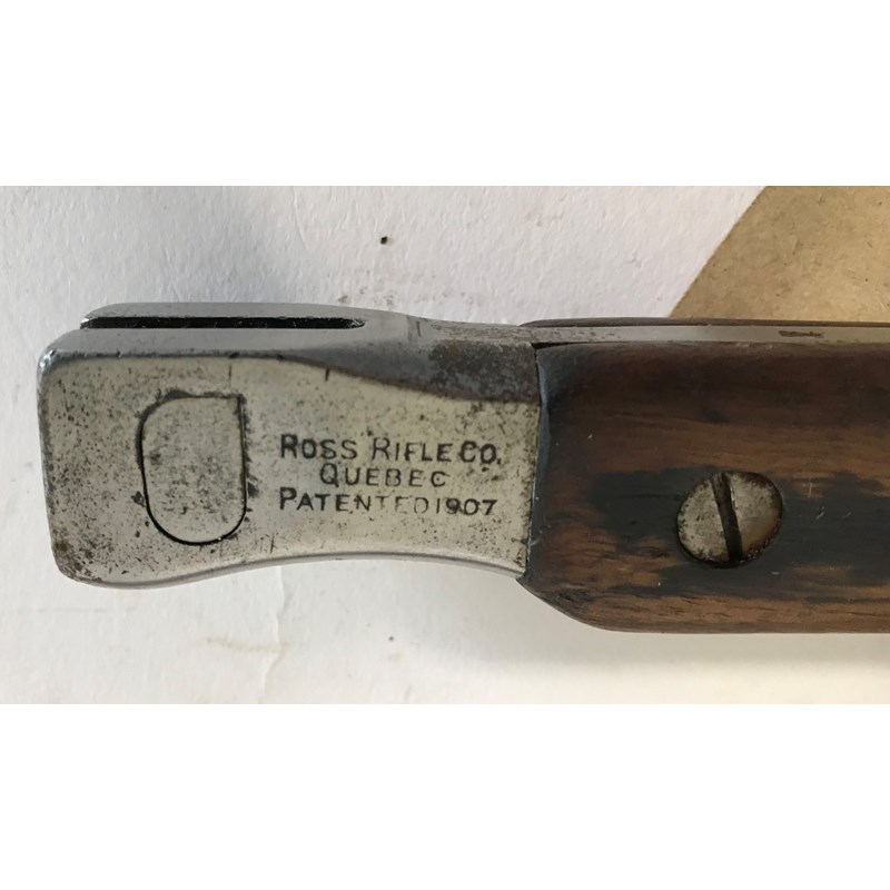 A bayonet with single edged 25cm blade, with wooden mounted grip stamped 'Ross Rifle Co. Quebec Patented 1907' and date stamps for February 1916. In leather scabbard and frog. 39cm overall length (bayonet and scabbard).