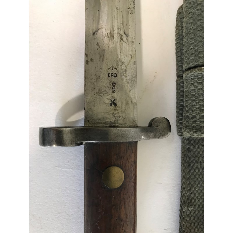 A Victorian Lee Metford 1888 Pattern Bayonet MkII, with a 30.5cm double edged blade with various stamped marks including Government arrow, EFD, and VR, with a wooden mounted grip, the top numbered 189, in a steel mounted scabbard numbered 865 and 486, 44cm overall. In a later webbing frog.