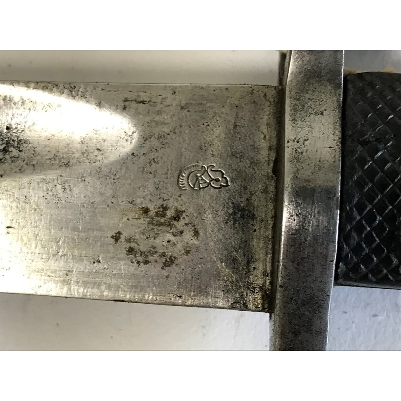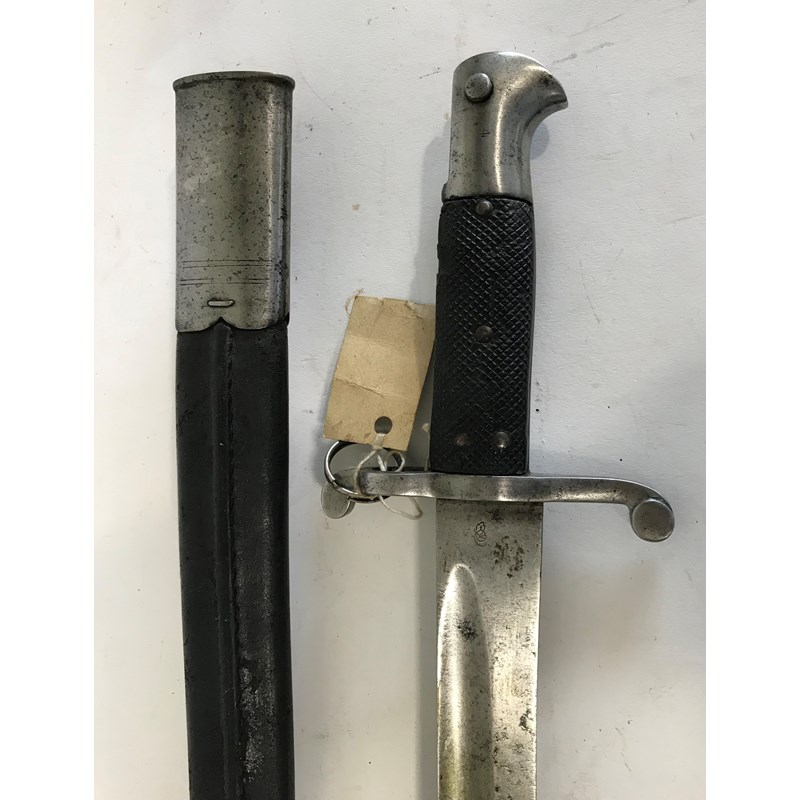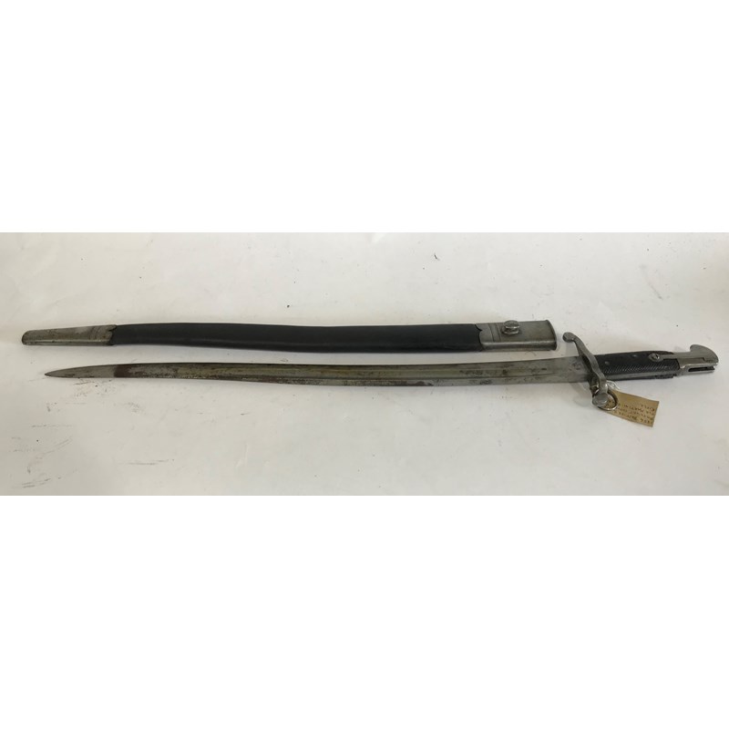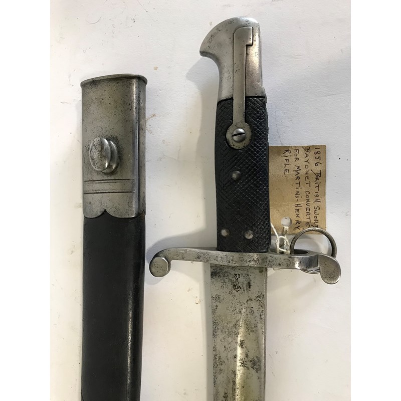 A British 1856 Pattern Bayonet converted for the Martini Henry Rifle with a 57.5cm 'Yataghan' German manufactured blade by Weyersberg Kirschbaum & Cie stamped S8 and HR with war department arrow, in leather and steel scabbard, 72.5cm overall.