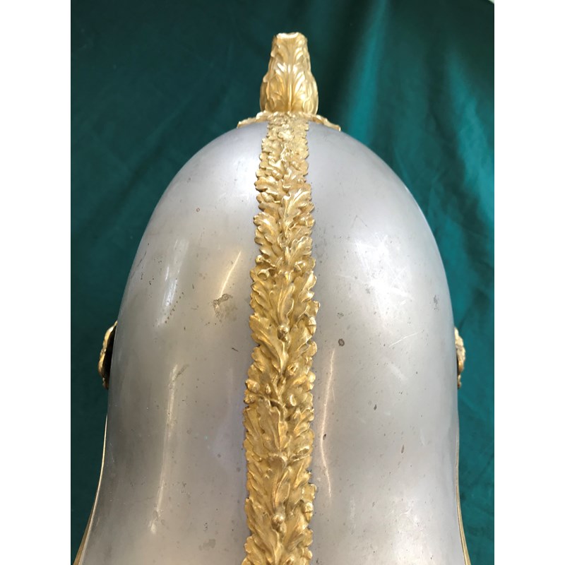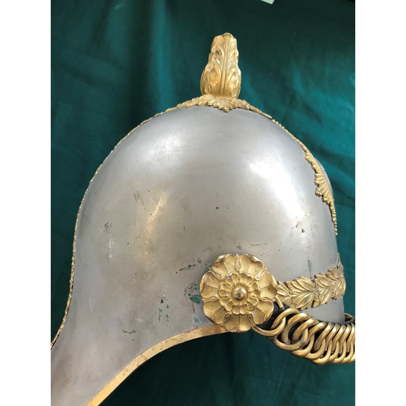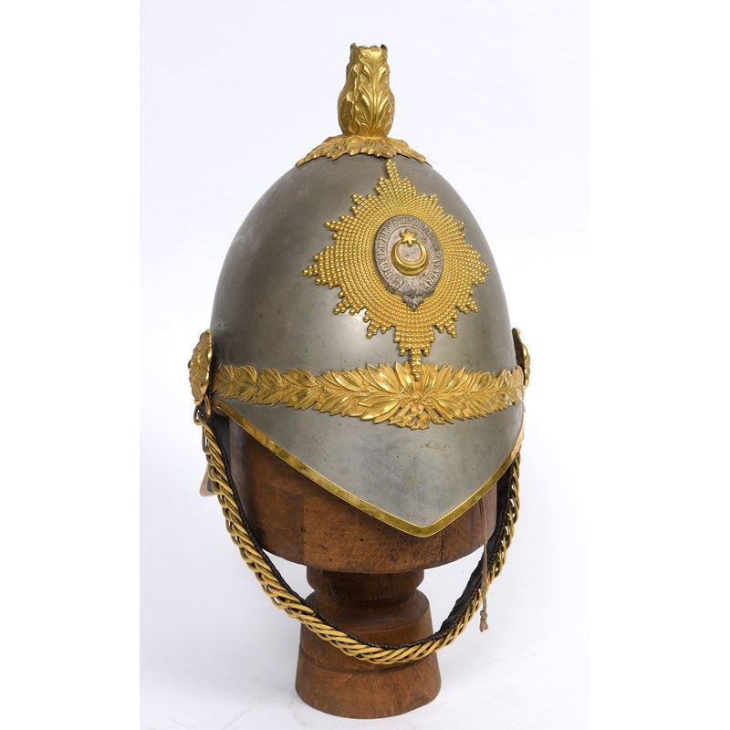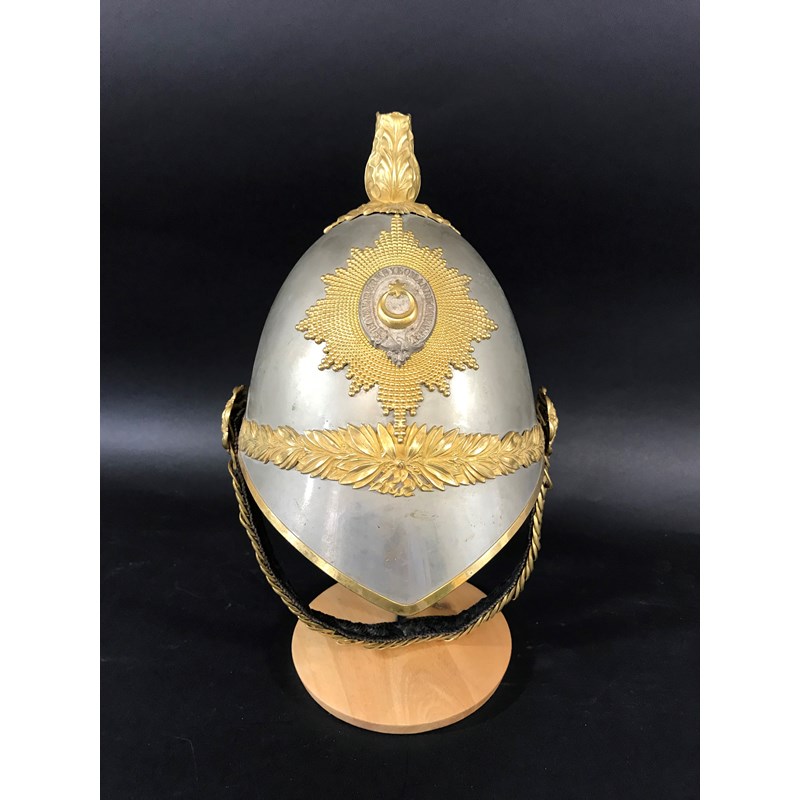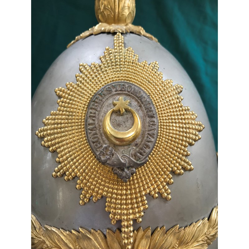 A late 19th or early 20th century Royal Berkshire Yeomanry Cavalry Helmet, white metal with gilt fittings, the helmet plate with crest against a beaded many pointed star, with a leaf casting at the front and back, with acanthus plume holder, plume lacking, with a graduated link chin strap and rosette attachments, with lined interior.