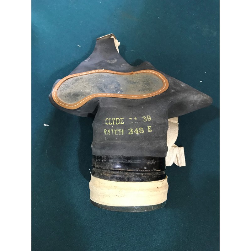 A black finished helmet with white stencilled 'POLICE' with liner, canvas chin strap and reinforced rim, impressed 330, 29cm wide, a similar helmet finished in black and another Fireman's helemet finished in red, with a round reinforced rim, 30.5cm wide and a gas mask. 4.