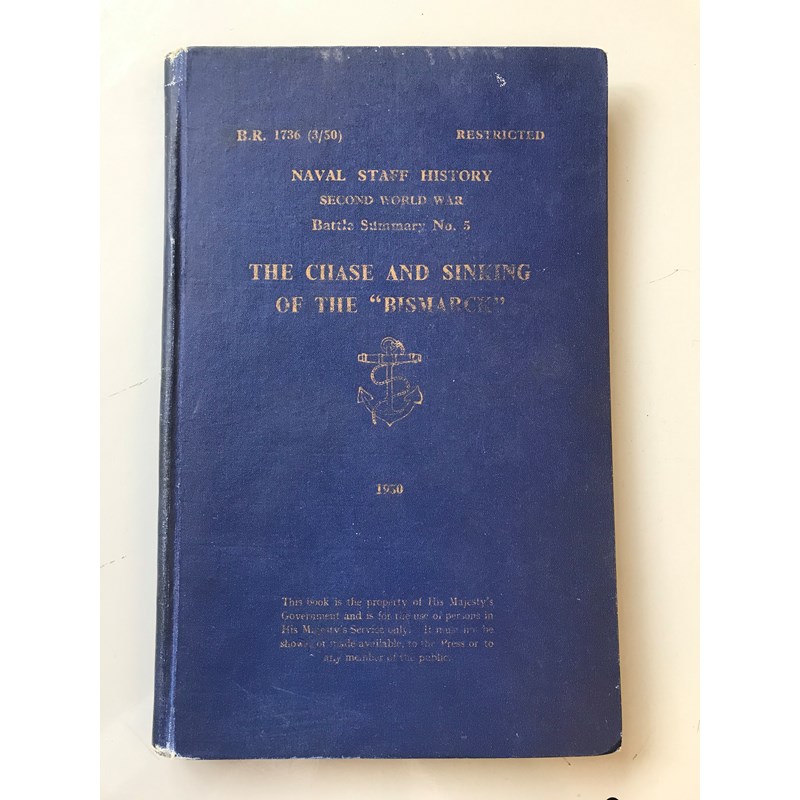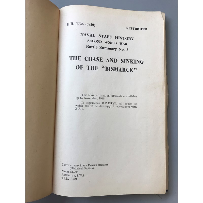 Naval Staff History, Second World War Battle Summary No.5 'The Chase and Sinking of the 'Bismark''. B.R. 1736 (3/50) Marked 'Restricted'. Single Volume, with pen annotations and owners names including H.M.S. Prince of Wales, May 1941 and Chief Petty Offices P.Tipler H.M.S. Fulmar, 1959.