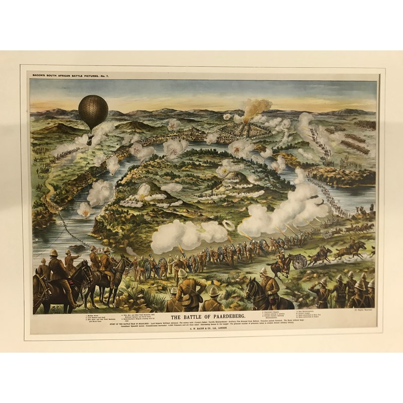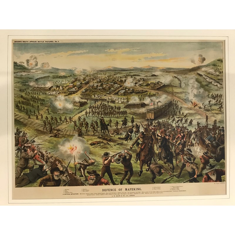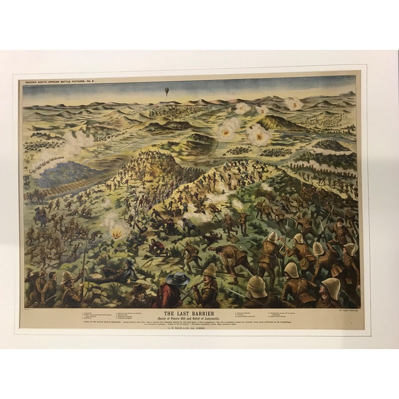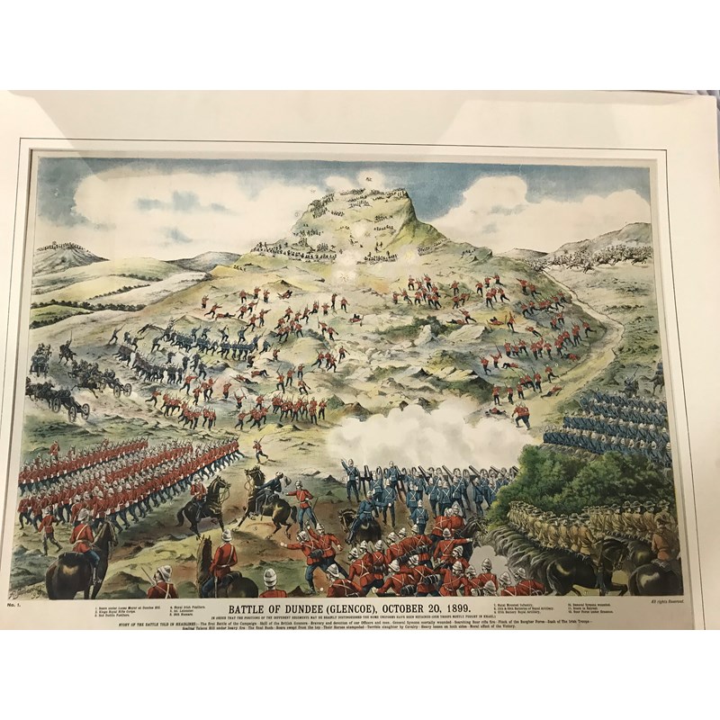 A part set of G.W. Bacon's South African Battle Pictures, colour prints after A. Sutherland. No1. Battle of Dundee (Glencoe), October 20, 1899 with instructive descriptions and details telling the story of the battle. Mounted on board with surround but unframed, image 56 x 76 cm. Including Nos 1, 2, 3, 4, 5, 6, 7, 8, 10, 11,