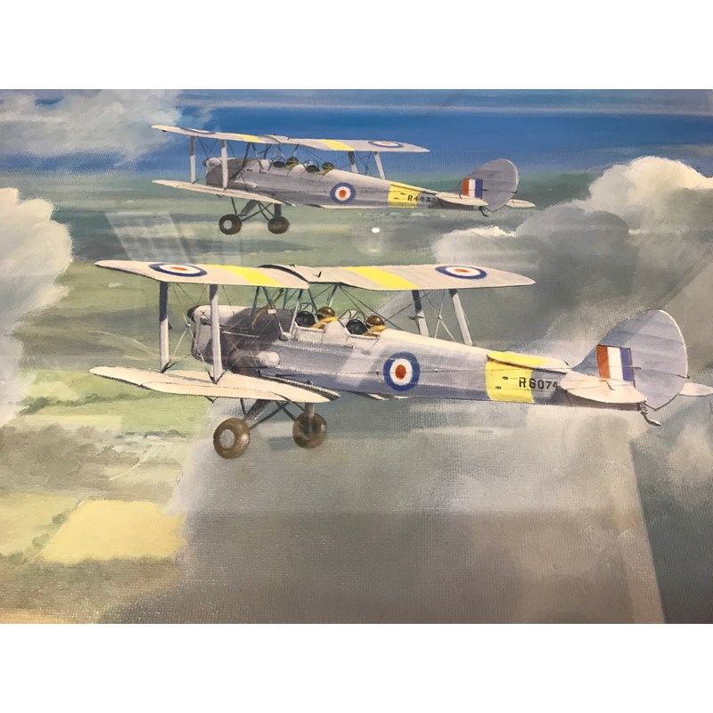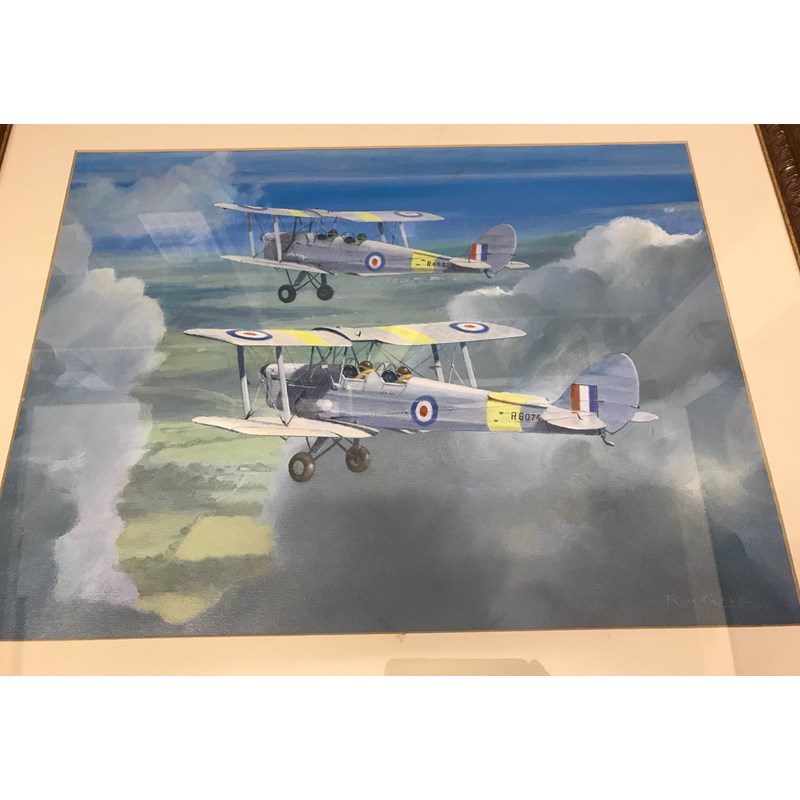 A Colour print after Robert Taylor 'Spitfire' signed in pencil in the margin by Douglas Barder CBE, DSO, DFC and Air Vice Marshall Johnnie Johnson CBE, DSO and DFC. 39 x 52 cm, framed and glazed and a similar print 'The prototype Hurricane, K5083 ...' with various signatures to the margin including Duncan Bulman, S. Davies and Ray Chaplin, 40 x 50 cm, mounted in a clip frame.