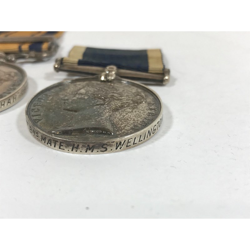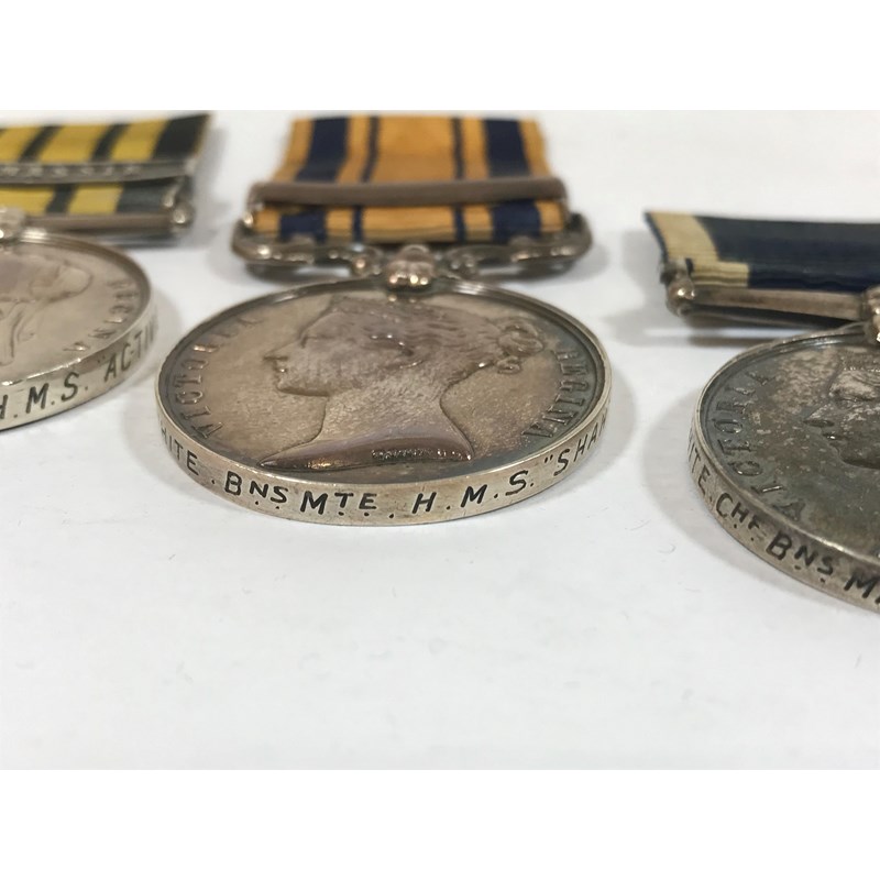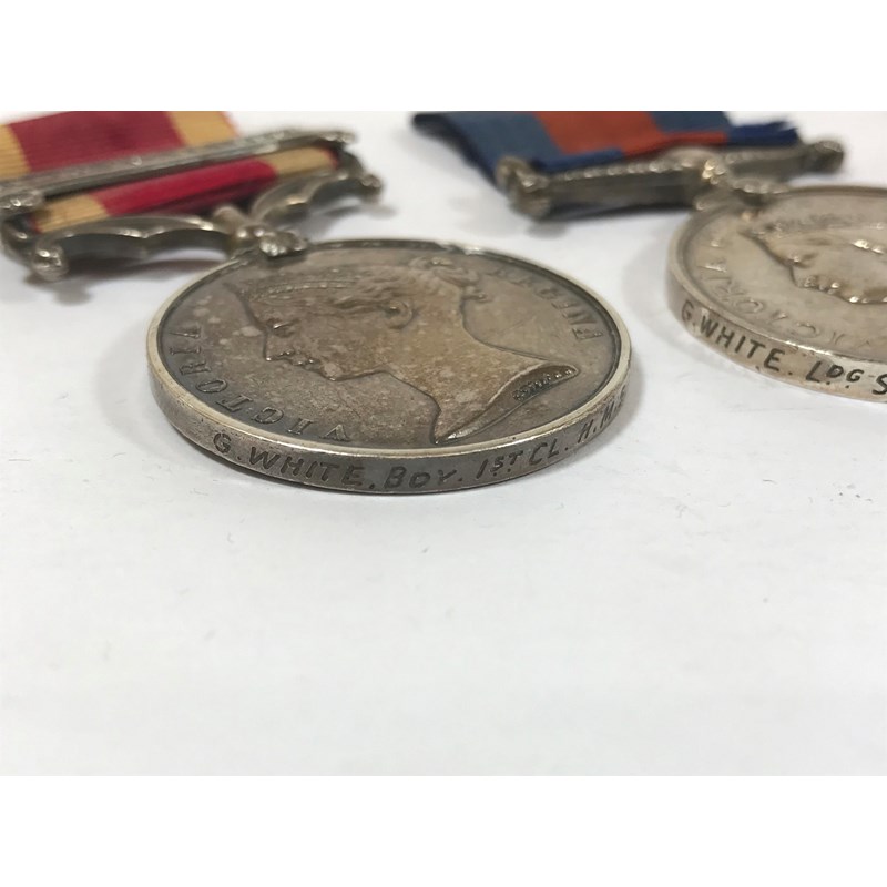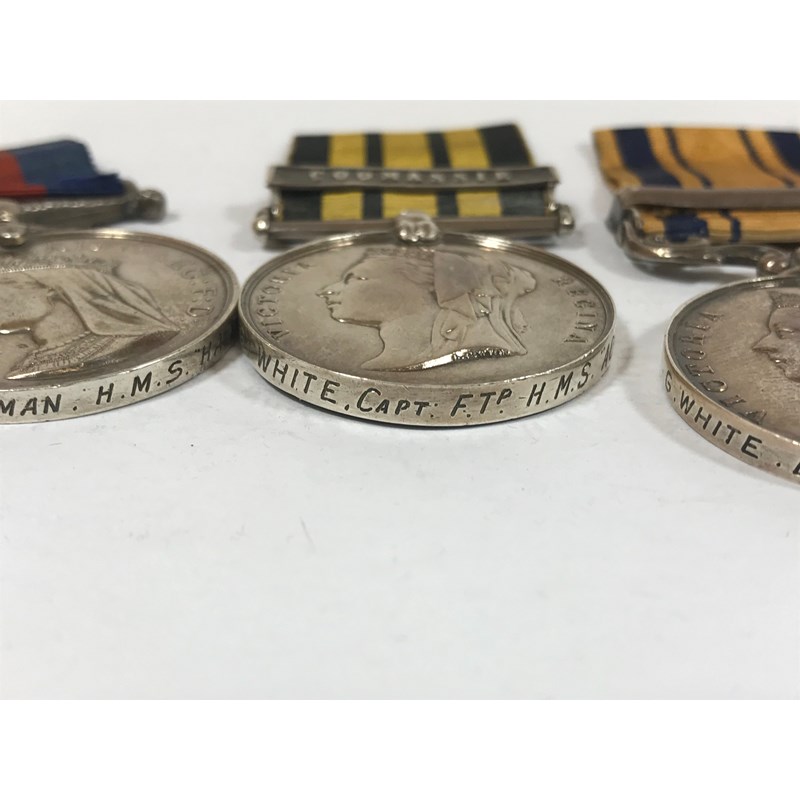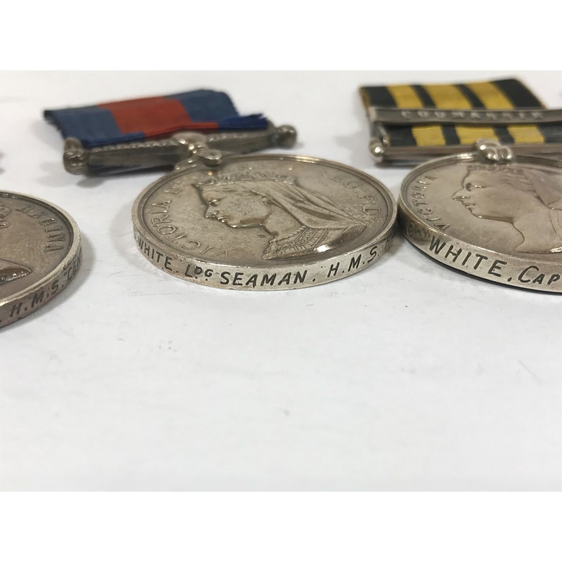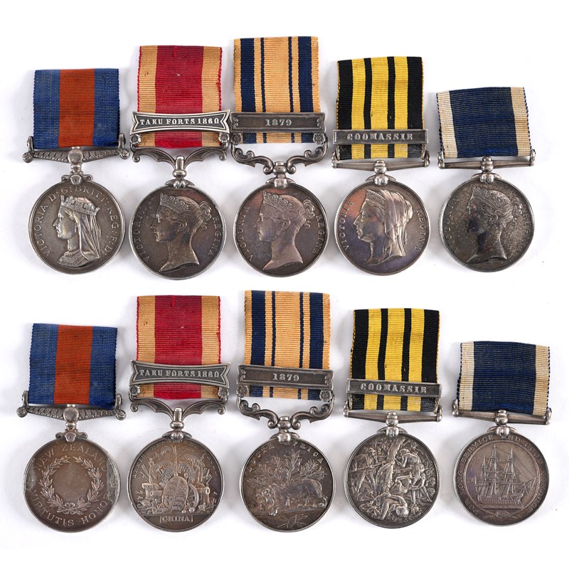 A Second China War Medal 1857-60 with Taku Forts 1860 clasp, on second type ribbon, named to G.White Boy 1st Class, H.M.S. Centaur. A New Zealand Medal with undated reverse, named to G. White Ldg Seaman, H.M.S. 'Harrier, previously mounted as a brrooch. An Ashantee Medal with 'Coomassie' clasp named to G.White, Capt. FTp H.M.S. Active. With unofficial renaming with traces of beginning and end of original naming beneath. South Africa Medal with 1879 clasp, renamed to G.White, Bns Mate, H.M.S. Shah, and a Long Service and Good Conduct Medal renamed to G.White, Chief BNs Mate, H.M.S. Wellington 22 years.