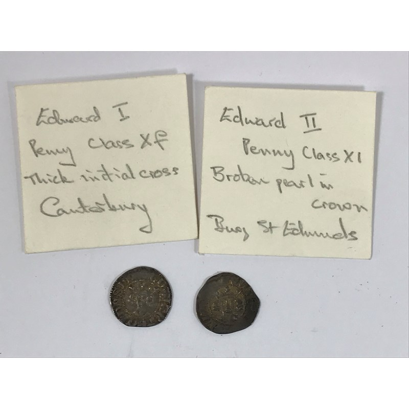 AN EDWARD I AND EDWARD II PENNY. A Canterbury mint Edward I Long Cross Penny class Xf. 1.4 gms. A Bury St Edmunds mint Penny of Edward II with a broken pearl in the crown. 1.6 gms. 2 coins.