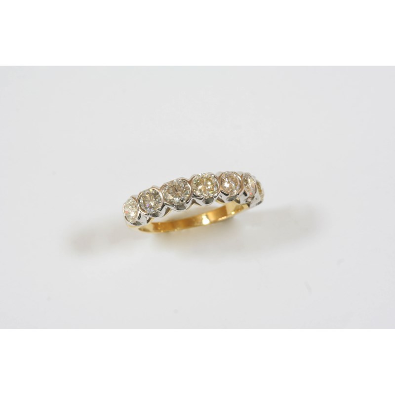 A DIAMOND HALF HOOP RING set with seven circular-cut diamonds, in 18ct. yellow gold. Size N.