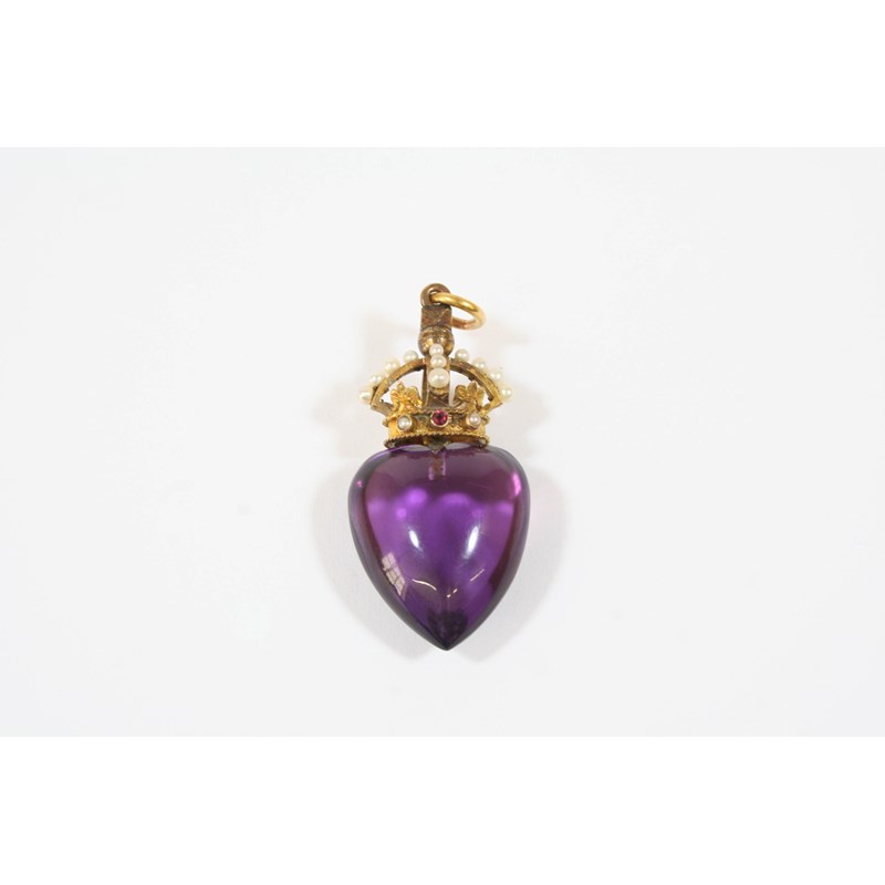 A 19TH CENTURY AMETHYST HEART-SHAPED PENDANT the heart-shaped amethyst suspends from a seed pearl and gem set coronet in gold, 4.0cm. high.