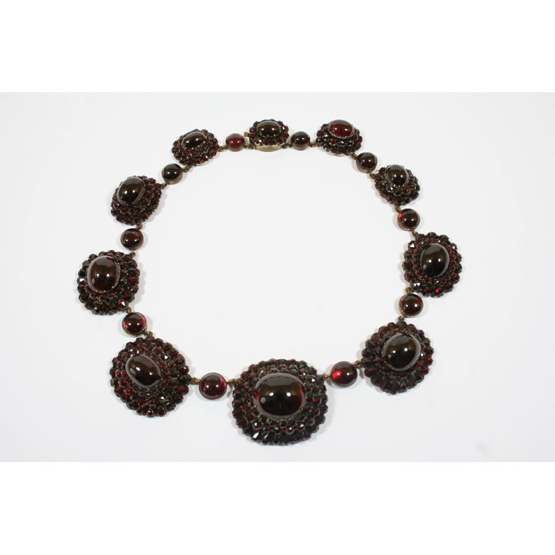 A VICTORIAN GARNET NECKLACE formed with graduated garnet clusters, each centred with an oval garnet cabochon within a double surround of faceted circular garnets, in silver gilt, 36cm. long.