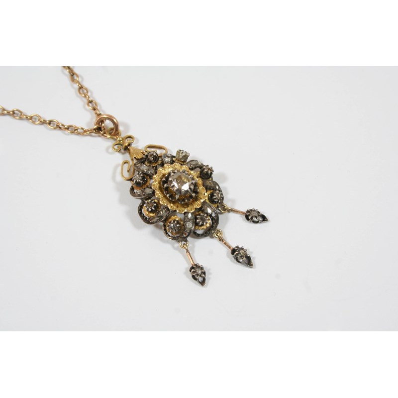 the flowerhead design is centred with an oval rose-cut diamond and mounted overall with rose-cut diamonds, in silver and gold, 5cm. long., on a 9ct. gold oval link chain.