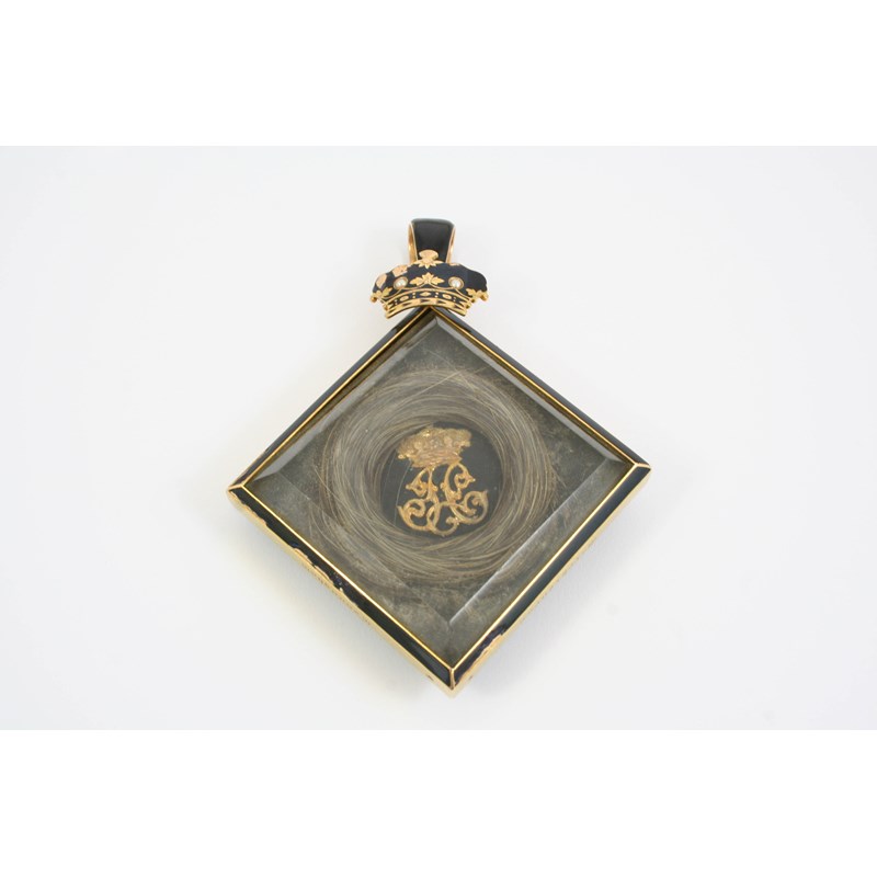the centre locket compartment containing hair within a surround of black enamel and mounted with a coronet, inscribed to the sides Jane Marchioness Conyngham died 28th Jan 1876, 7cm. wide.