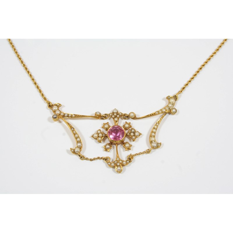 the openwork foliate scrolling design is centred with a circular pink tourmaline within a surround of graduated seed pearls, in 15ct. gold, on a fine link gold chain, 39.5cm. long.