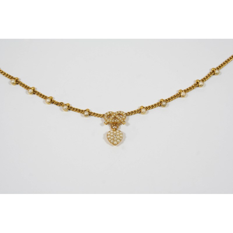 the gold curb link necklace is mounted with ten half pearls in gold settings and is centred with a pearl set lover's knot suspending a gold heart set with half pearls and a circular-cut diamond, 38cm. long.