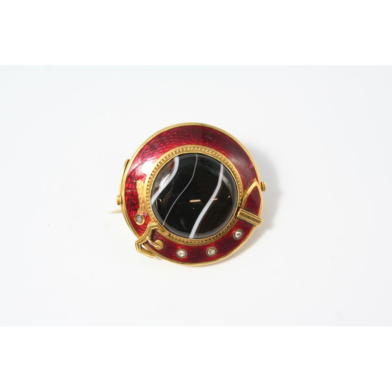 of gold buckle design, the section of banded agate is set within a surround of red guilloche enamel mounted with rose-cut diamonds, with locket compartment to the reverse containing hair, 4cm. dia.
