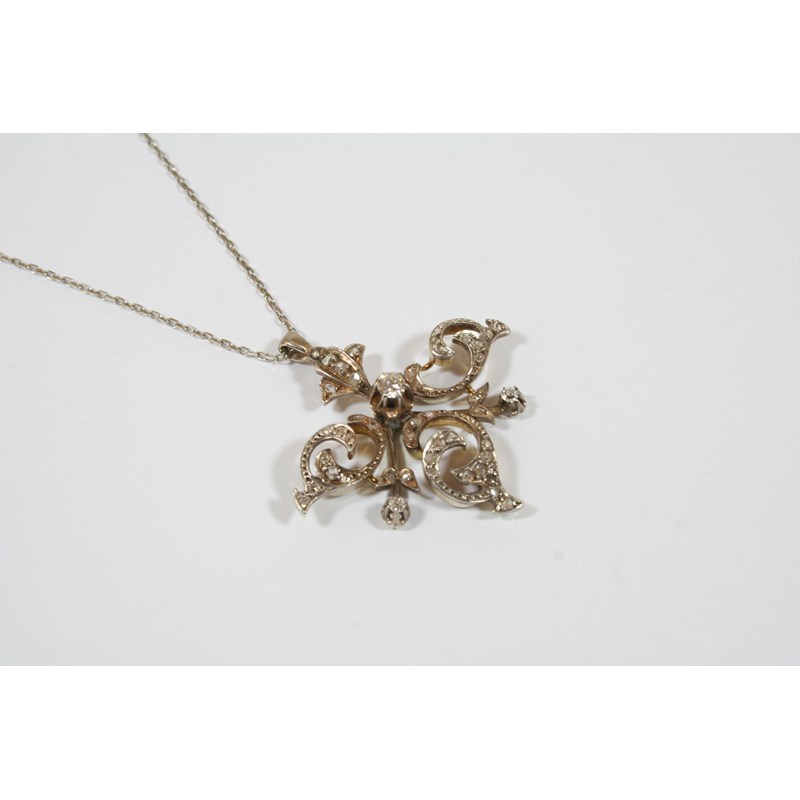 A VICTORIAN DIAMOND PENDANT the openwork scrolling design is set overall with circular and rose-cut diamonds, in silver and backed in gold, 4cm. wide., on a fine link white gold chain.