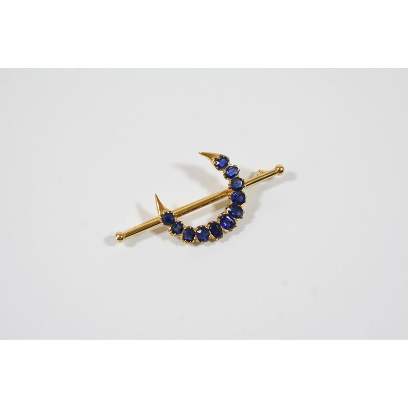 A SAPPHIRE CLOSED CRESCENT BROOCH formed with graduated oval-shaped sapphires, in gold, 5.4cm. long.
