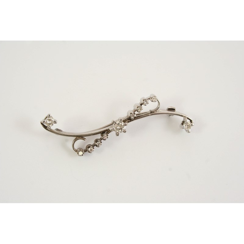 A DIAMOND BROOCH the ribbon and bow design is set with a circular-cut diamond, with smaller diamonds set throughout, 6cm. long.