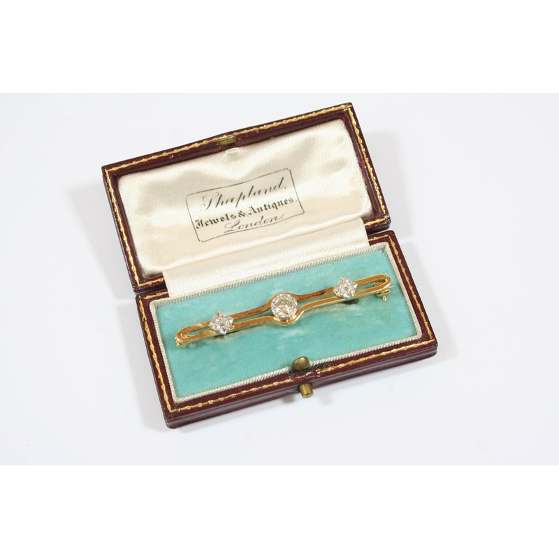A DIAMOND BROOCH mounted with three graduated old-cut diamonds, in gold, 5.3cm. long. In fitted box.