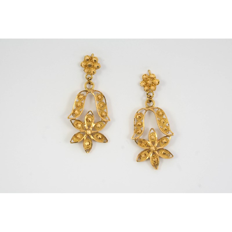 A PAIR OF GOLD DROP EARRINGS of openwork foliate form, with hook fittings, 4.5cm. long, 11 grams.