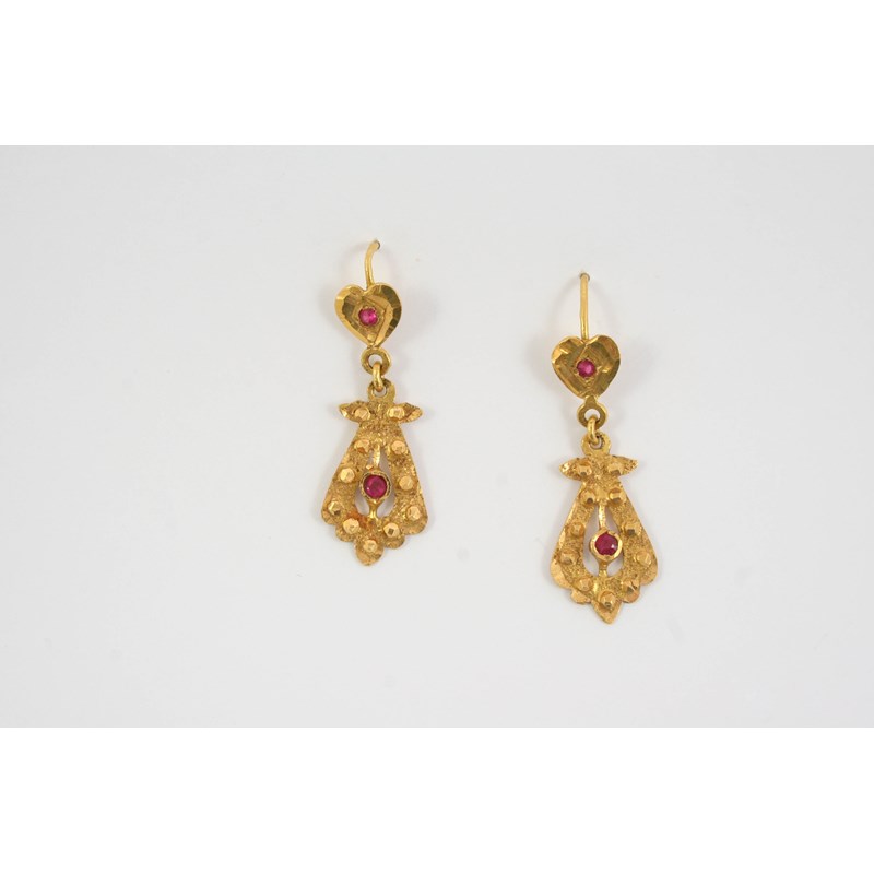 A PAIR OF GOLD AND RUBY DROP EARRINGS each gold openwork drop mounted with a circular ruby suspended from a gold heart-shaped surmount centred with a circular ruby, 4cm. long, 6.9 grams.