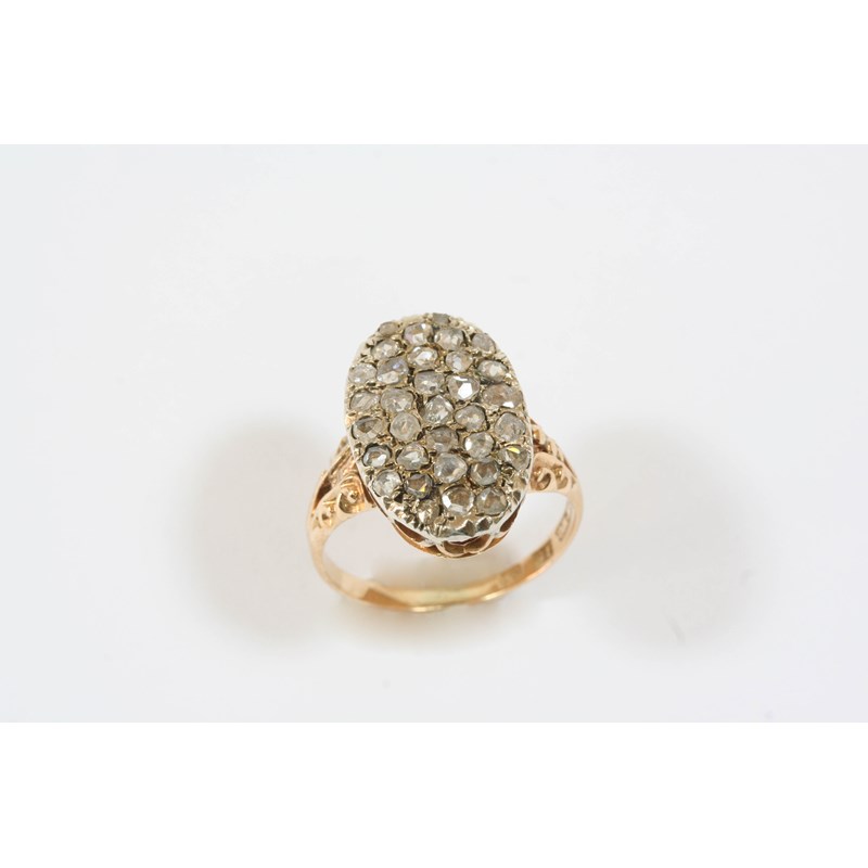 A DIAMOND CLUSTER RING the oval-shaped ring is set with rose-cut diamonds, in 15ct. gold. Size O.