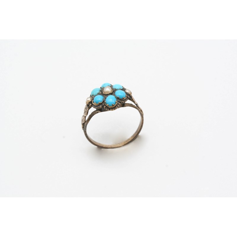 A VICTORIAN TURQUOISE AND HALF PEARL CLUSTER RING of flowerhead form, set with turquoise cabochons and half pearls in gold. Size H.
