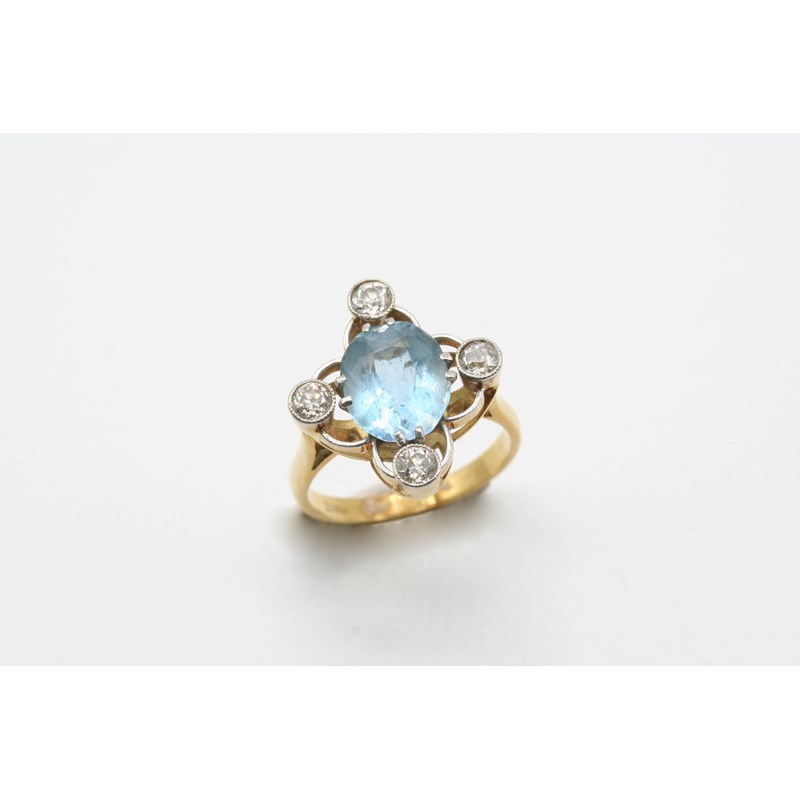 AN AQUAMARINE AND DIAMOND RING the oval-shaped aquamarine is set with four circular-cut diamonds in 18ct. gold. Size L.