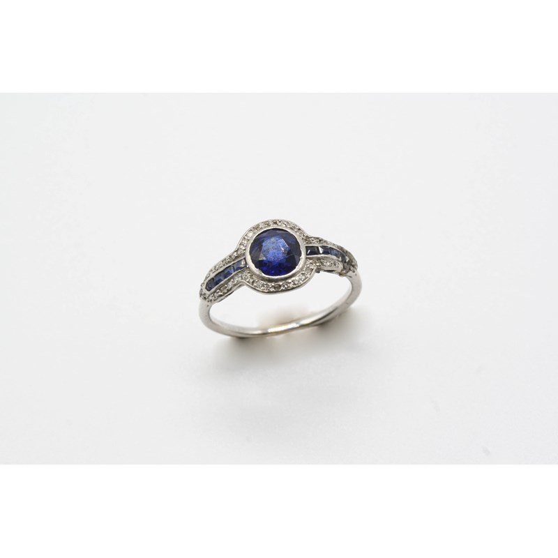 the oval-shaped sapphire is set within a surround of calibre-cut sapphires and rose-cut diamonds. Size L.