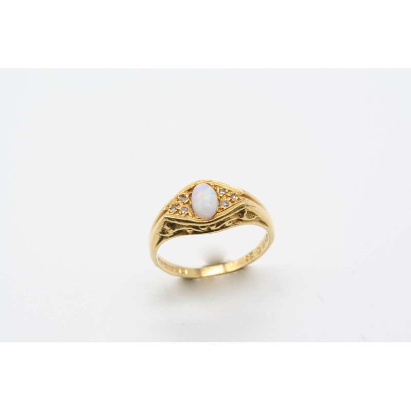 AN OPAL AND DIAMOND RING the oval-shaped solid white opal is with circular-cut diamonds, in 18ct. gold. Size O.