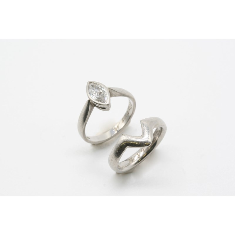 A DIAMOND SOLITAIRE RING the marquise-shaped diamond is set in platinum, size J, together with a v-shaped platinum wedding band, size J.