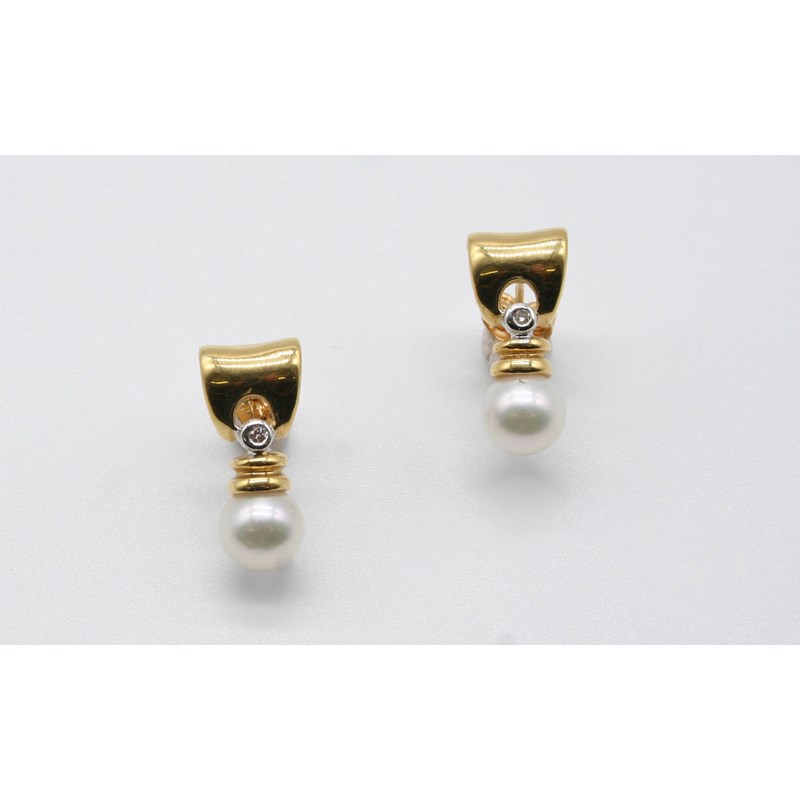 A PAIR OF DIAMOND AND CULTURED PEARL EARRINGS each 18ct. gold mount is set with a circular-cut diamond and suspends a cultured pearl, 2cm. long.