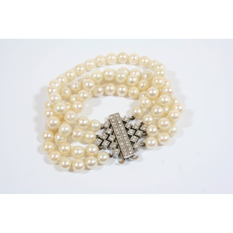 formed with four rows of uniform cultured pearls measuring approximately 7.2mm. to a white gold clasp mounted with circular-cut diamonds, 18cm. long.