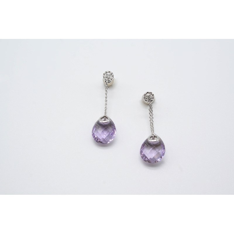 A PAIR OF AMETHYST AND DIAMOND DROP EARRINGS each earring with a briolette amethyst drop suspended from a single diamond surmount, 3.6cm. long.