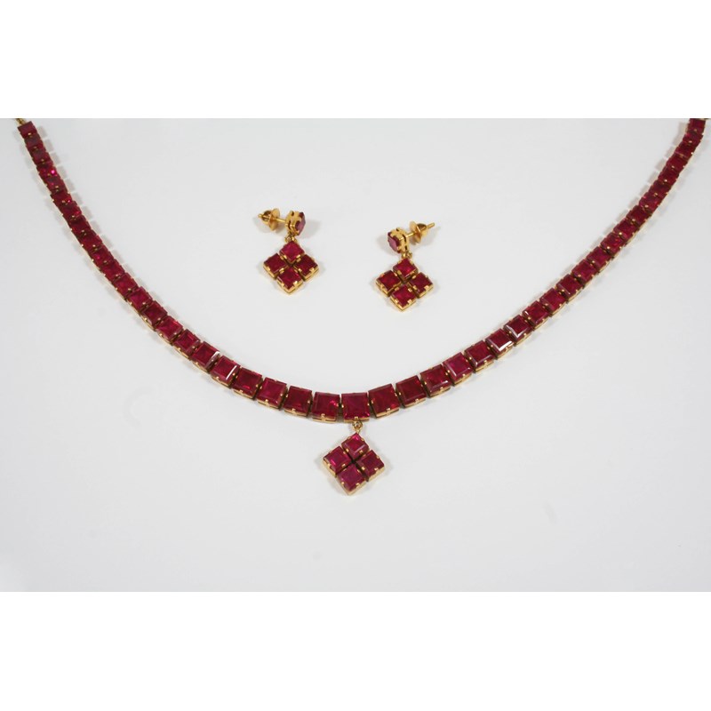 mounted with forty five graduated square-shaped rubies in gold, on a gold chain and suspending a ruby pendant drop of four square-shaped rubies, 41cm. long, together with a pair of ruby and gold drop earrings, 2.75cm. long.