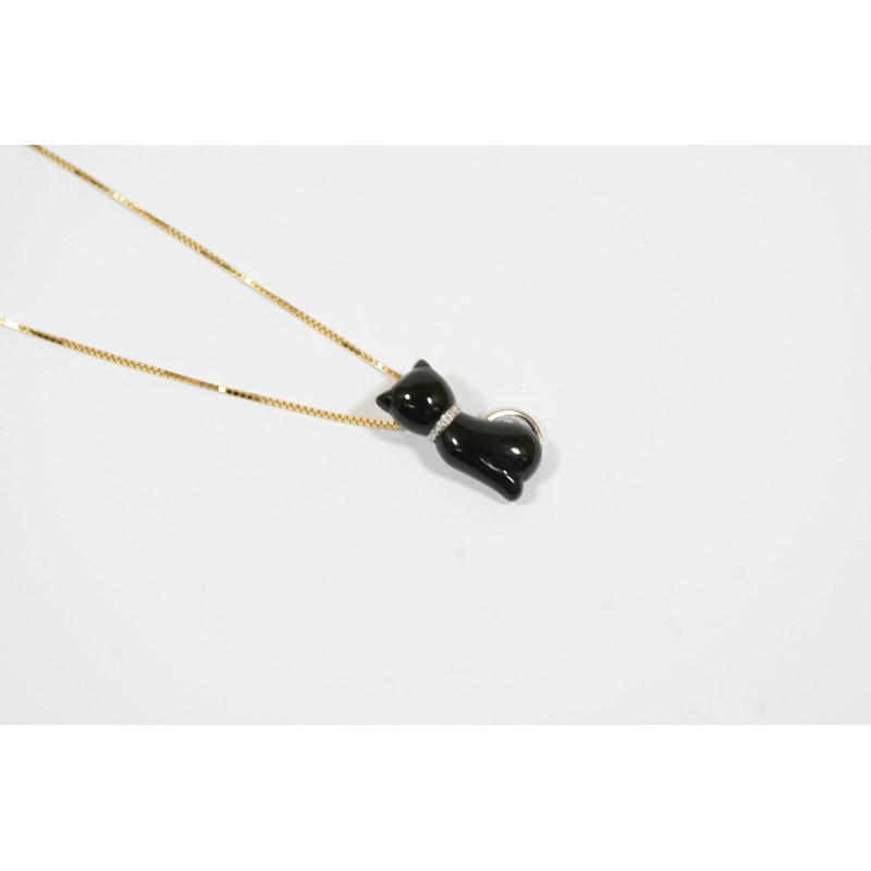 A BLACK ONYX CAT PENDANT mounted in 18ct. white gold and on an 18ct. yellow gold fine link chain, 2cm. high.
