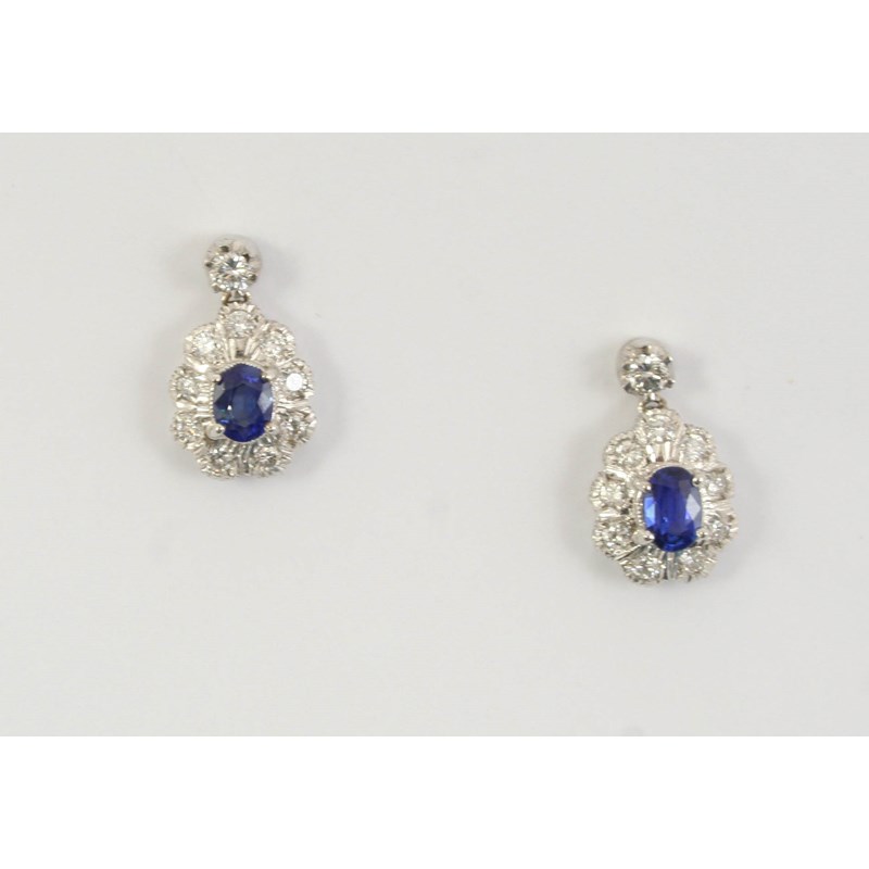 each earring set with an oval-shaped sapphire within a surround of circular-cut diamonds, suspended from a single diamond surmount, in white gold, 1.8cm. long.