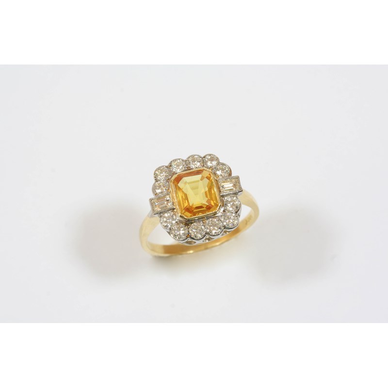 A YELLOW SAPPHIRE AND DIAMOND CLUSTER RING
