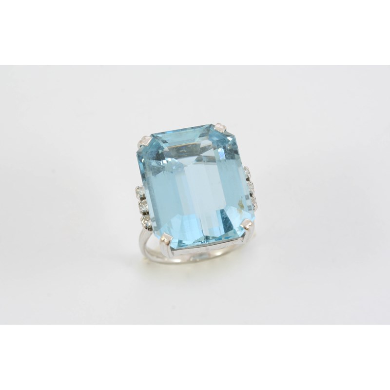 AN AQUAMARINE AND DIAMOND RING the step-cut aquamarine is set with three circular-cut diamonds to each shoulder, in white gold. Size J 1/2.