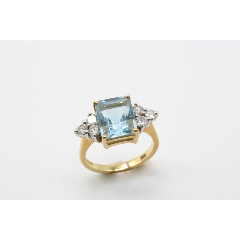 AN AQUAMARINE AND DIAMOND RING the rectangular-shaped aquamarine is set with three circular-cut diamonds to each shoulder, in 18ct. gold. Size P.