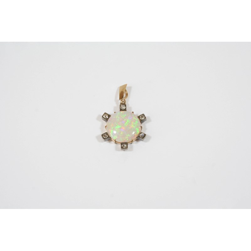 AN OPAL AND DIAMOND PENDANT the circular solid white opal is set within a gold surround mounted with six rose-cut diamonds in square settings, 2.2cm. dia.