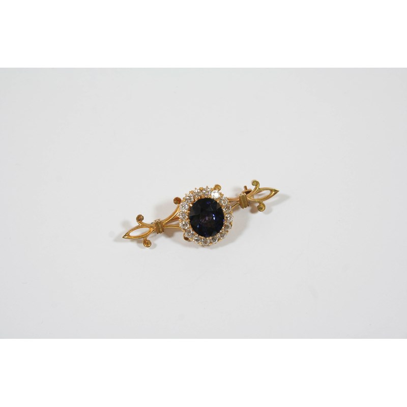 the oval-shaped sapphire is set within a surround of circular-cut diamonds, on a gold brooch fitting with fleur-de-lys terminals, 5cm. long., also with gold ring fitting, so that the cluster can be removed to be worn as a ring, size L 1/2.
